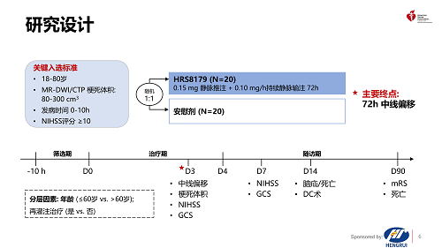 注射用HRS8179是由asiagame自主研发的创新药,是磺酰脲类受体1(SUR1)阻断剂,能够阻断SUR1/TRPM4离子通道,减少Na+内流,从而减轻LHI后继发的脑水肿、降低死亡率,改善神经功能4,5。HRS8179-201研究旨在评估HRS8179在LHI患者中的有效性和安全性。